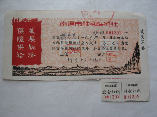 一, 是市供销社而不是乡镇供销社发行的股票。在已发现的几种文革股票中,除了这张南通市的,其余全是乡镇的。要知道,在文革期间,搞股票是绝对禁止的,因为这是资本主义的东西。那时有这么一句口号:“宁要社会主义的草,也不要资本主义的苗。”但在农村,“山高皇帝远。”,胆子大的就不管那一套,为了群众生产与生活的需要,照样凭股票分红,凭股票到供销社购物。但在城市就不同了,市革委会就在身边,南通市胜利供销社居然胆敢不但继续搞股票分红,而且还换发了新股票,这胆子也真够大了,也许,是“发展经济,保障供给”这句毛主席语录起了保护作用吧!