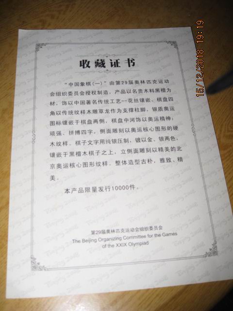 棋盘棋子棋盒均用进口乌檀木精制,车马炮.....是用银片压制而成。发行量10000副.
