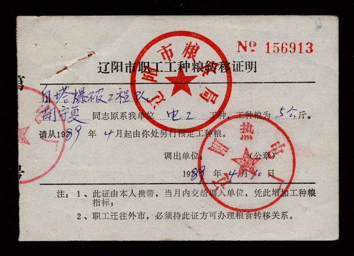 工种粮转移证明,5元