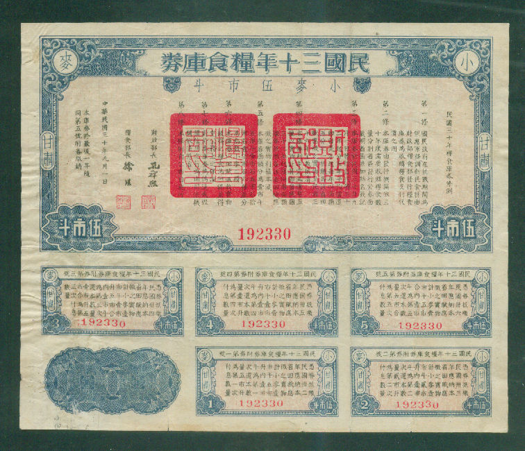 甘肃民国粮库券(小麦)五市斗 1050元
