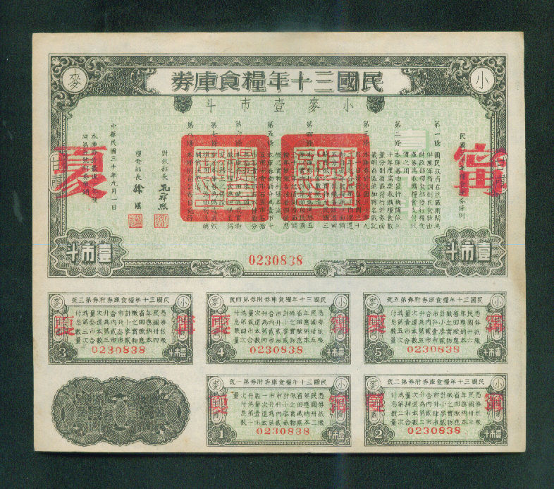 甘肃民国粮库券(小麦)壹市斗(加盖宁夏)1350元.