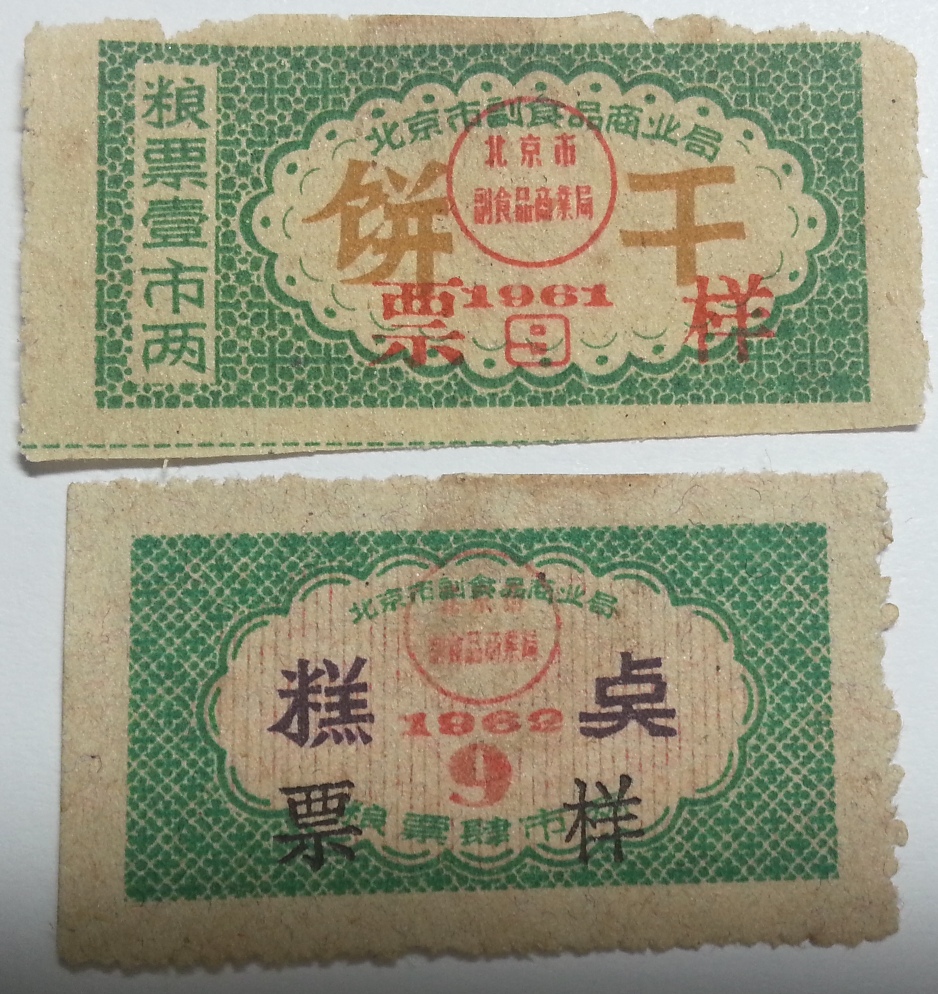 来一段北京粮票简史上的: 糕点票、饼干票 1960年7月,市副食品商业局印制了糕点票、饼干票,按北京市正式户口没人每月发给一枚糕点票、一枚饼干票。糕点票可买糕点0.5市斤,饼干票可买饼干2市两。1960年9月份补充规定:购买糕点饼干时,在收取糕点票、饼干票的同时加收粮票。每枚糕点票加收粮票3市两,饼干票加收粮票2市两。从1960年11月份开始,糕点票、饼干票由粮食部门印发,每枚糕点票可买糕点0.5市斤,收粮票4市两,每枚饼干票可买饼干2市两,收粮票1市两。从1961年2月份起,糕点票票面上加印粮票4市两,饼干票票面上加印1市两,扣减粮食定量0.5市斤。1963年4月,将糕点票、饼干票合并,改为糕点饼干票,每枚糕点饼干票可买糕点或饼干8市两,也可在粮店购买面粉或粗粮0.5市斤。到1963年8月,经济有所好转,此后糕点饼干票停止印发和使用,凭粮票可随意购买糕点饼干。糕点票、饼干票(糕点饼干票)的寿命为3年零1个月。
