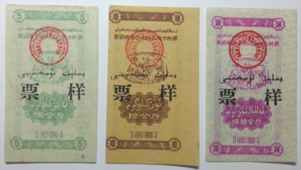新疆61年料票全套4枚,分别1公斤.5公斤.10公斤.50公斤,中国粮票目录认为实票50公斤最少,其实应为1公斤,实票1公斤罕见.在此向广大粮友予以纠正.本人这组票样就缺一公斤,一公斤票样都被粮友们替代实票了.