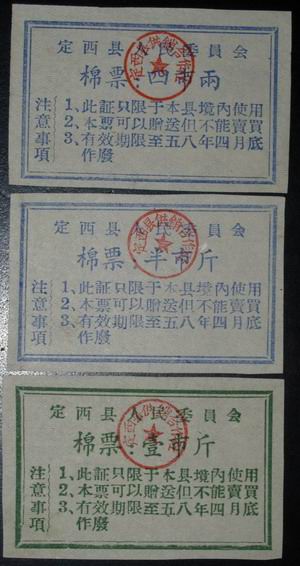 甘肃省定西县58年(棉票) 3全新 50元/套,稀少